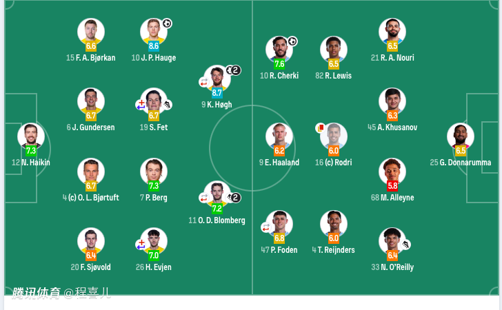 曼城首发:25-多纳鲁马、82-刘易斯、45-胡桑诺夫、68-阿莱恩、21-努里、16-罗德里、4-赖因德斯、33-奥赖利、47-福登、10-谢尔基、9-哈兰德。