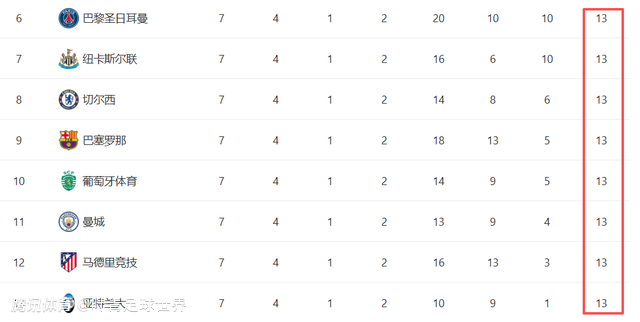 巴黎圣日耳曼13分10个净胜球,纽卡13分10个净胜球,切尔西13分6个净胜球,巴萨13分5个净胜球,葡萄牙体育13分5个净胜球,曼城13分4个净胜球,马竞13分3个净胜球,亚特兰大13分1个净胜球。
