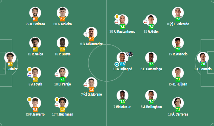 皇家马德里:库尔图瓦;巴尔韦德,劳尔-阿森西奥,赫伊森,卡雷拉斯;居莱尔(80'布拉欣-迪亚斯),卡马文加,贝林厄姆;马斯坦托诺(74'冈萨洛-加西亚),姆巴佩,维尼修斯