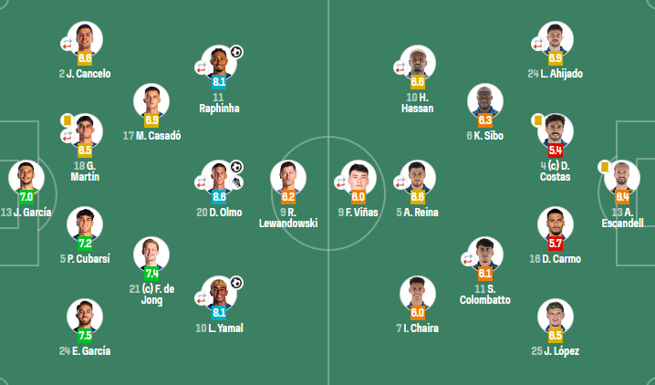 巴塞罗那(4-2-3-1):霍安-加西亚;埃里克-加西亚,库巴西,赫拉德-马丁(46'孔德),坎塞洛(60'巴尔德);德容,卡萨多;亚马尔(79'巴德吉),奥尔莫(79'贝尔纳尔),拉菲尼亚(60'费尔明);莱万多夫斯基