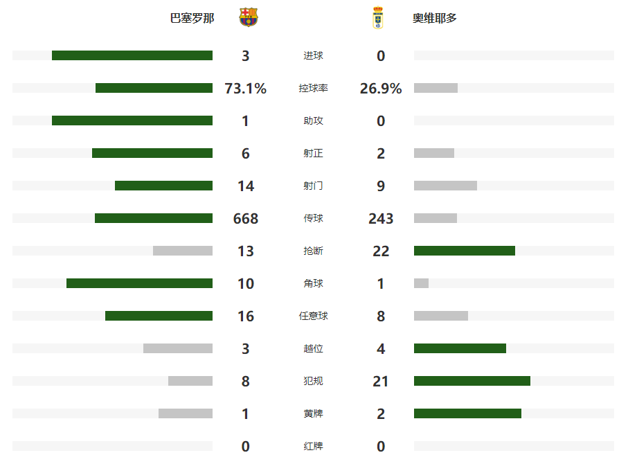 北京时间1月26日凌晨,西甲第21轮中,巴萨主场3-0大胜奥维耶多,本赛季联赛主场保持10战全胜,反超皇马1分领跑积分榜。奥尔莫传射建功,亚马尔打入精彩侧勾进球,拉菲尼亚单刀挑射破门。