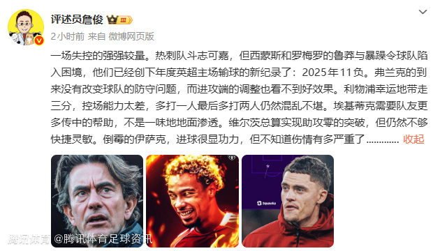 詹俊:一场失控的强强较量。热刺队斗志可嘉,但西蒙斯和罗梅罗的鲁莽与暴躁令球队陷入困境,他们已经创下年度英超主场输球的新纪录了:2025年11负。弗兰克的到来没有改变球队的防守问题,而进攻端的调整也看不到好效果。