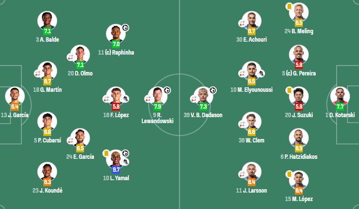 巴塞罗那(4-2-3-1):霍安-加西亚;孔德,库巴西,赫拉德-马丁(72'阿劳霍),巴尔德;埃里克-加西亚(46'贝尔纳尔),奥尔莫(72'拉什福德);亚马尔,费尔明(79'卡萨多),拉菲尼亚;莱万多夫斯基(82'费兰-托雷斯)