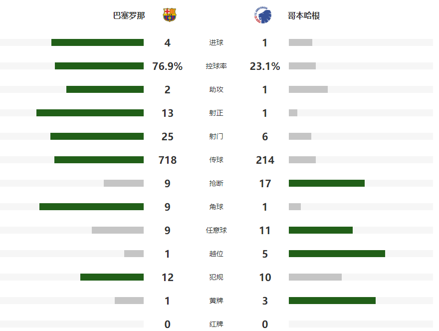 北京时间1月29日凌晨,欧冠联赛阶段第8轮中,巴萨主场4-1逆转哥本哈根,取得欧冠三连胜,排名升至欧冠第5,直接晋级欧冠16强。达达森先拔头筹,莱万射失单刀后扳平比分并制造点球,亚马尔破门反超,拉菲尼亚主罚点球建功,拉什福德任意球直接破门。