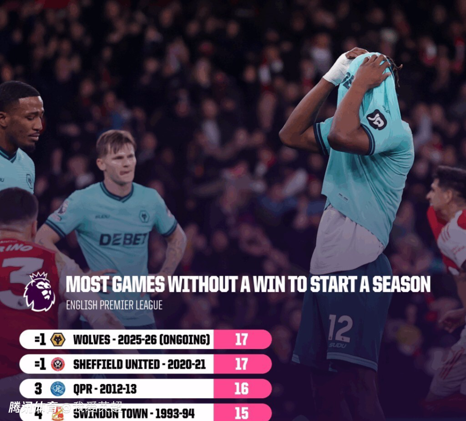 本轮0-2告负后,狼队在英超遭遇耻辱性的10连败。17轮过后狼队2平15负仅积2分,未尝一胜,这一糟糕表现,也追平谢菲尔德联在2020-2021赛季创下的英超历史开局最长不胜纪录。