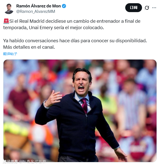 阿隆索下课之后,阿韦洛亚担任皇马主帅,签约半年。1月29日,名记拉蒙-阿尔瓦雷斯在社交平台上透露,如果皇马决定赛季结束后换帅,埃梅里将是首选。