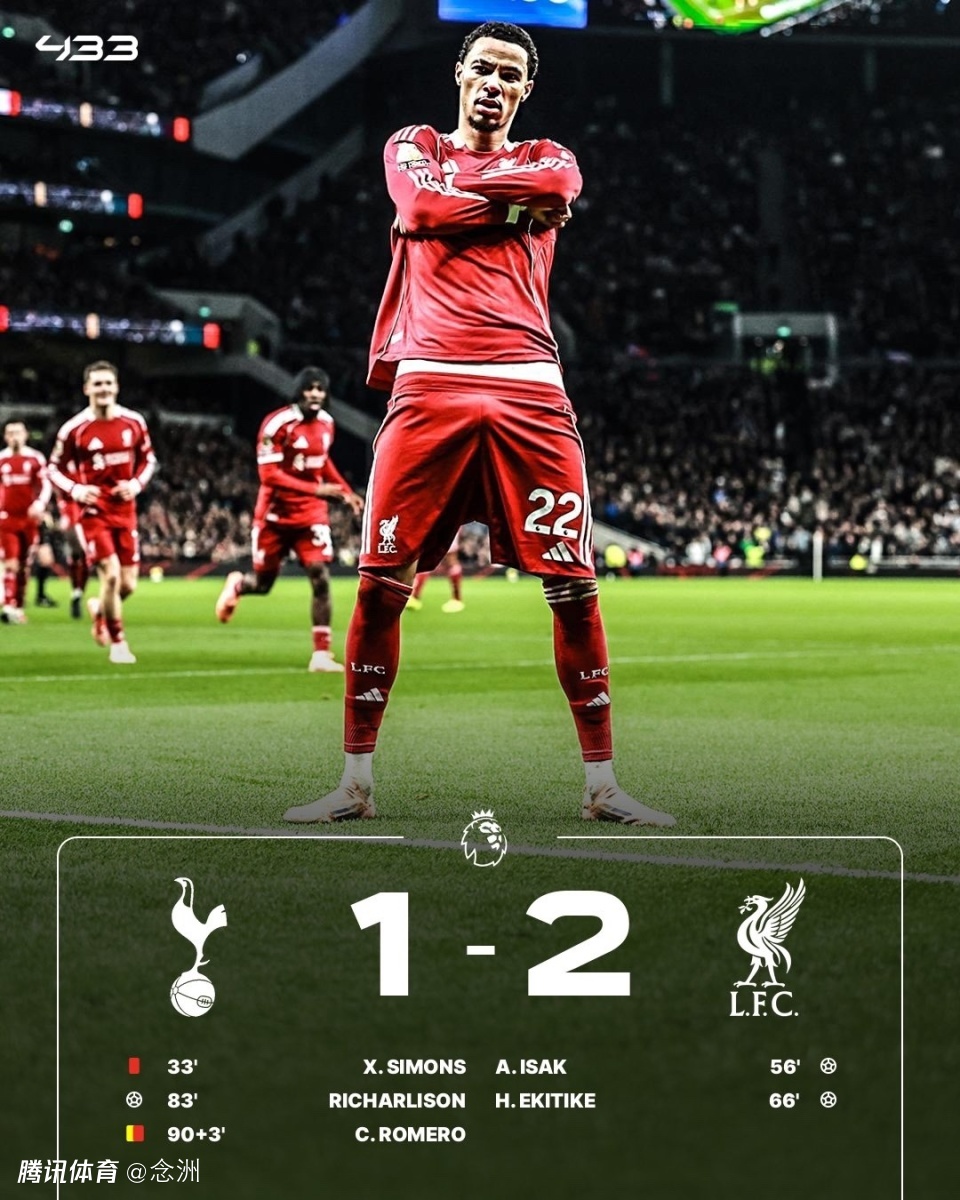 英超第17轮,利物浦客场2-1九人热刺,各项赛事三连胜。哈维-西蒙斯蹬踏范戴克,被直红罚下,伊萨克接维尔茨助攻破门后伤退,埃基蒂克再下一城,里沙利松扳回一球,罗梅罗补时阶段两黄变一红被罚下。