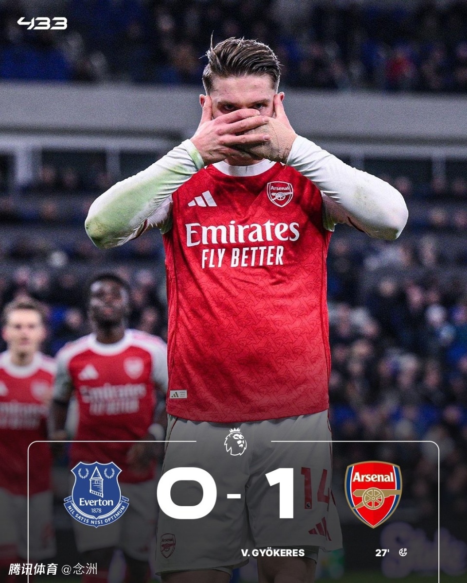 阿森纳客场1-0小胜埃弗顿,以2分优势领跑积分榜,夺得圣诞冠军。奥布莱恩手球送点,哲凯赖什点射建功,特罗萨德、苏维门迪先后中柱。