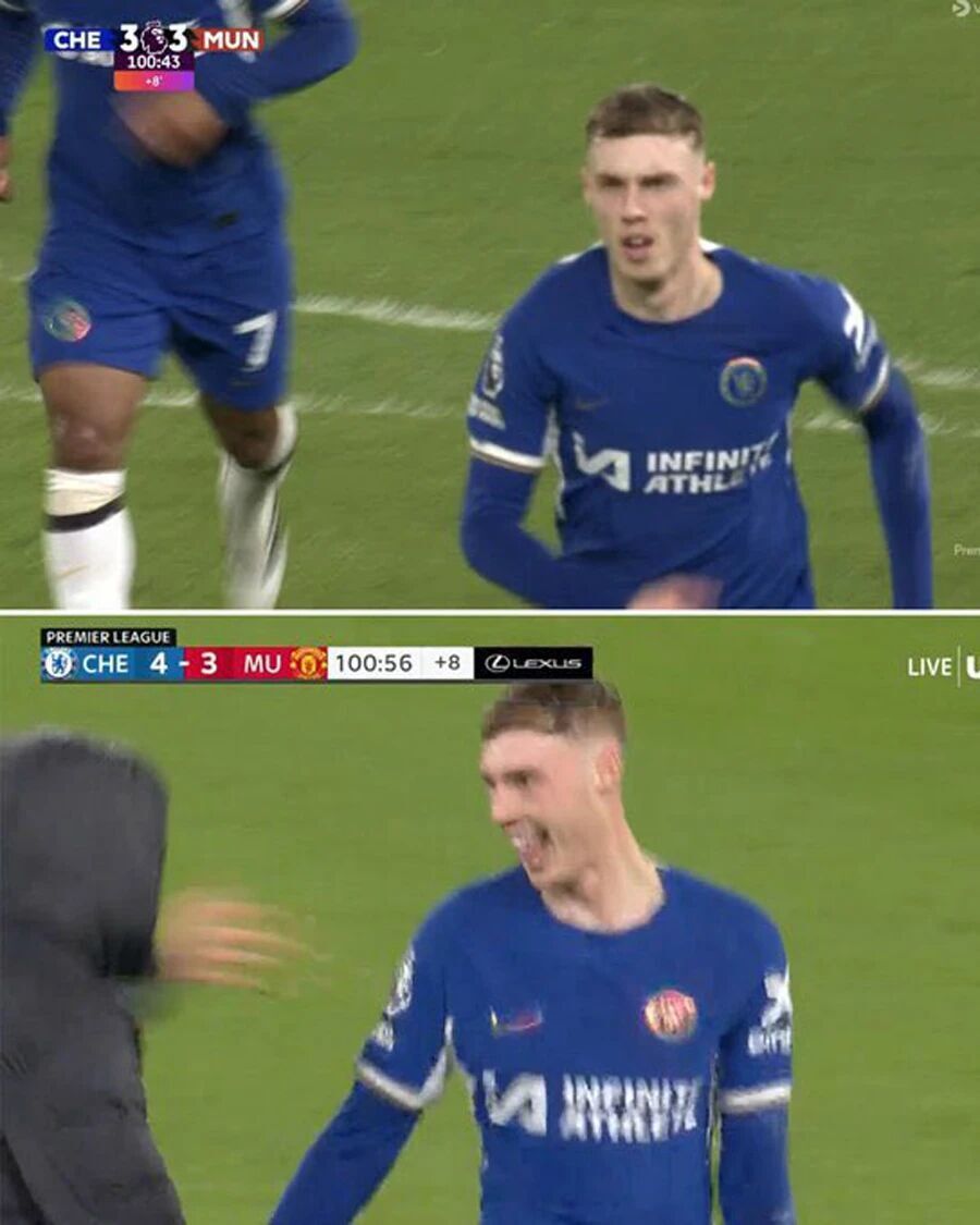 这并不是夸大其词,帕尔默在切尔西一线队也曾暴打曼联。2024年,蓝军4-3力克红魔的比赛中,他完成了帽子戏法,包括点球扳平和补时绝杀。