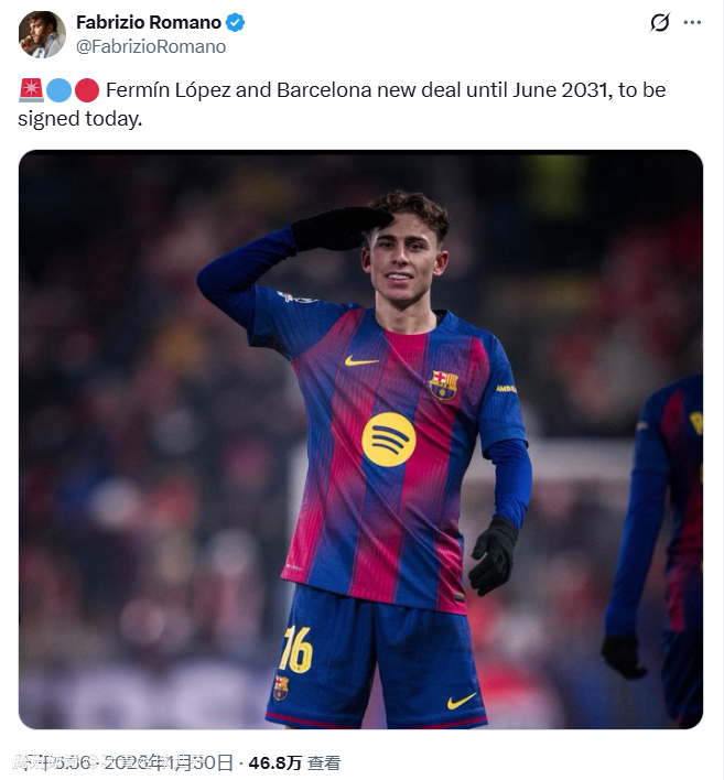 巴萨将费尔明续约至2031年,这是对费尔明的重视。根据德转统计,巴萨全队只有4名球员的合同在2031年到期:霍安-加西亚、亚马尔、埃里克-加西亚、阿劳霍。费尔明续约之后,也将是巴萨合同年限最长的球员之一。