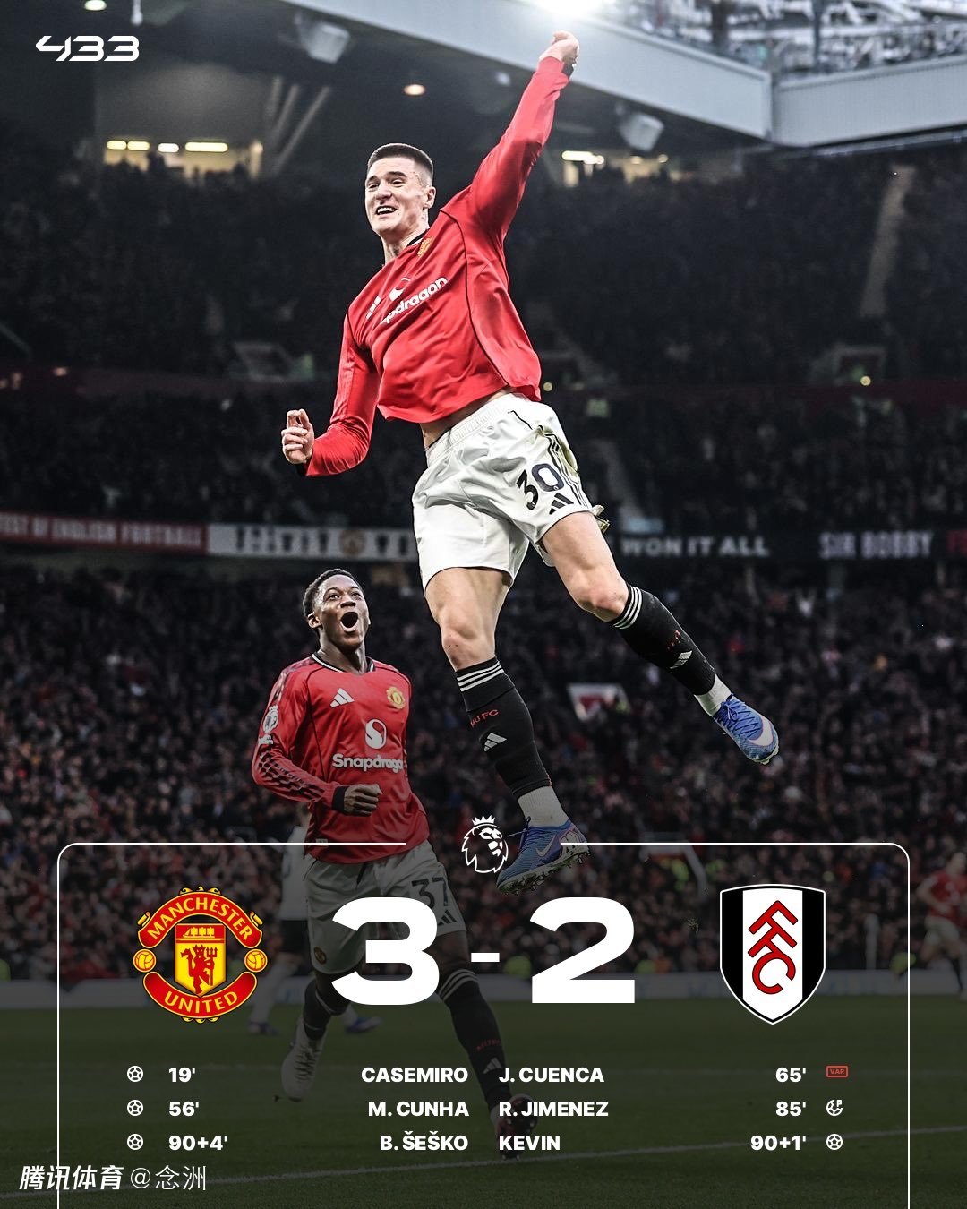 英超第24轮,曼联主场3-2绝杀富勒姆,三连胜升第4。库尼亚造点被改判,B费助攻卡塞米罗头球破门首开纪录,卡塞米罗助攻库尼亚抽射扩大比分,谢什科替补中柱,马奎尔送点,希门尼斯点射扳回一城,凯文世界波扳平比分,B费助攻谢什科抽射完成绝杀。