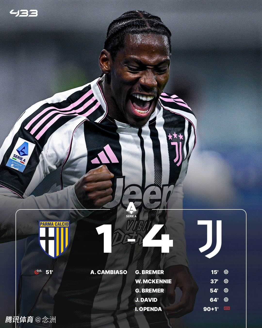 尤文图斯客场4-1击败帕尔马,2分优势超越少赛一场的罗马升至第4位。布雷默、麦肯尼先后破门,孔塞桑射中横梁,坎比亚索自摆乌龙,布雷默、戴维下半场帮助尤文锁定胜局。
