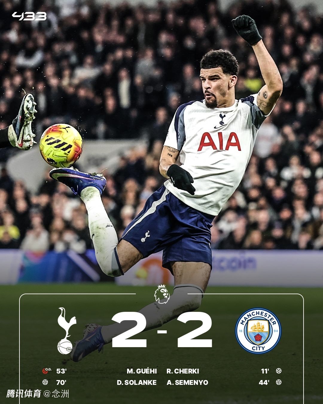 曼城客场2-2战平热刺,6轮仅1胜积47分位居第2,距榜首阿森纳6分。热刺联赛6轮不胜,积29分名列第14。谢尔基首开纪录,塞梅尼奥扩大比分,哈兰德和B席助攻,索兰克双响+蝎子摆尾扳平。