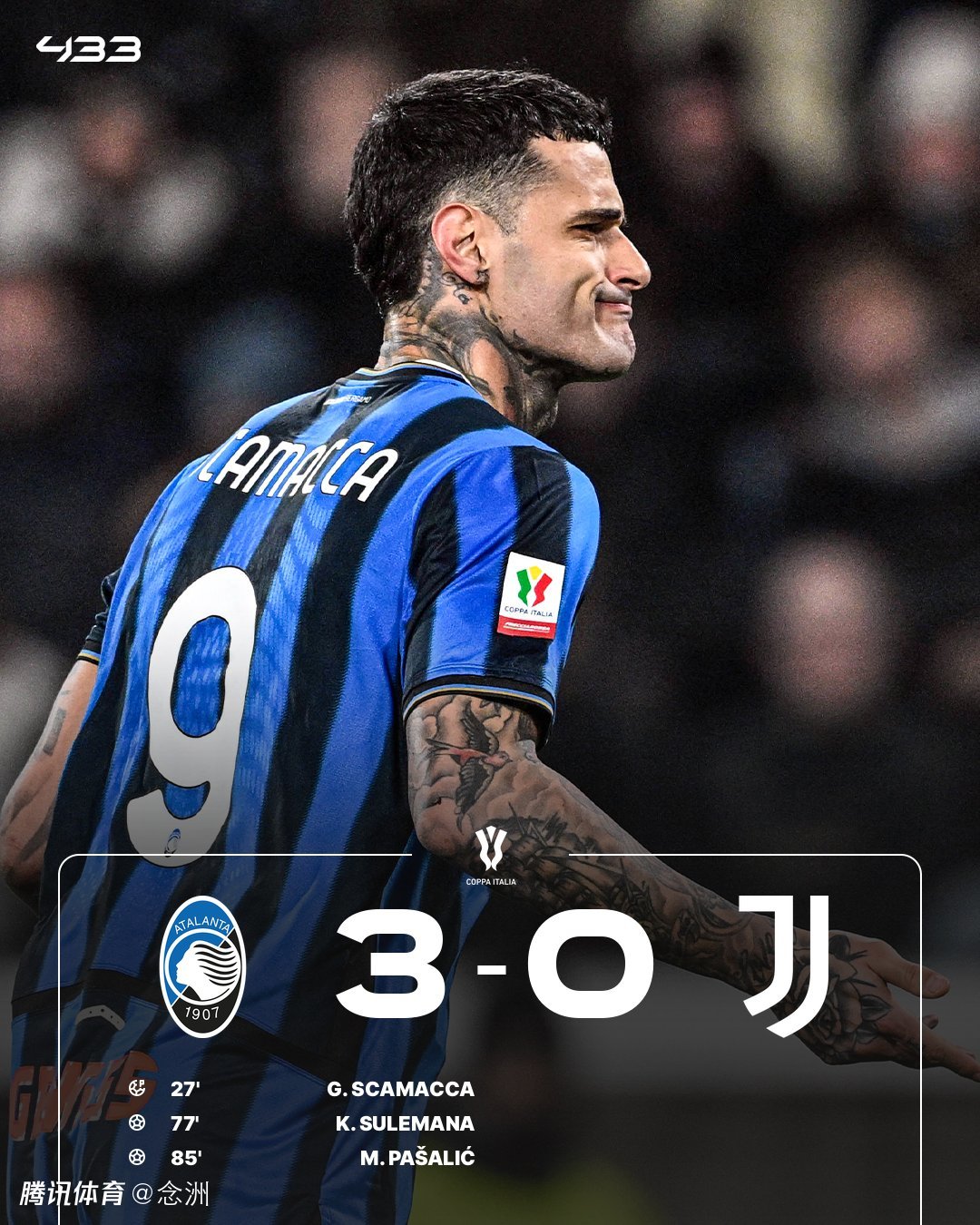 意大利杯1/4决赛,尤文图斯0-3负于亚特兰大,无缘四强。小孔塞桑抽射中楣,布雷默送点,斯卡马卡点射首开纪录,苏莱马纳替补建功,帕萨利奇破门。