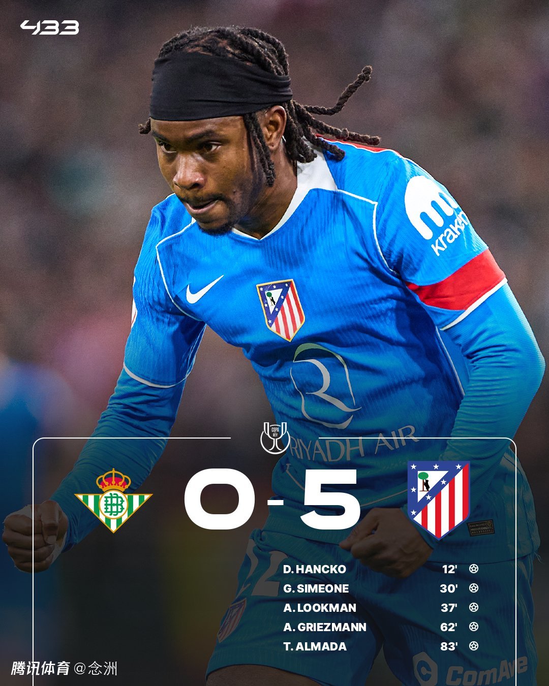 国王杯1/4决赛,马竞客场5-0大胜贝蒂斯晋级四强。上半场,汉茨科、小西蒙尼、卢克曼连进三球。易边再战,卢克曼助攻格列兹曼再下一城,阿尔马达锦上添花。
