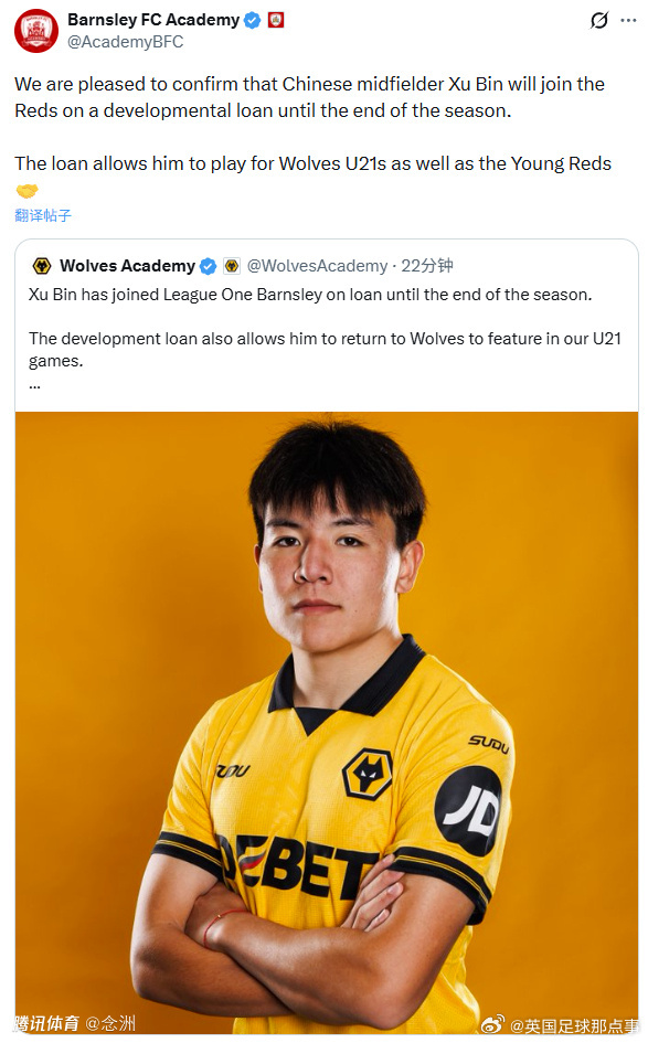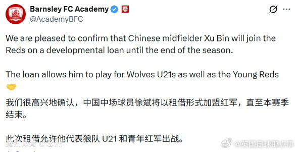 声明中明确写道:“徐彬既可以代表狼队U21队参赛,也可能代表巴恩斯利的青年队参赛(The loan allows him to play for Wolves U21s as well as the Young Reds)。”