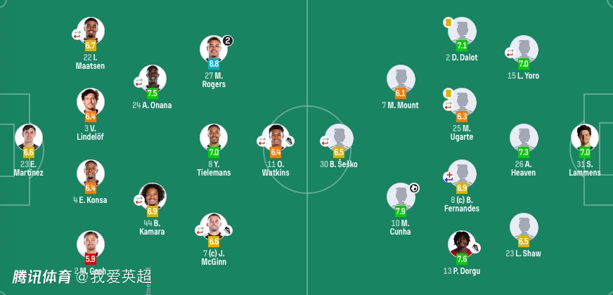 阿斯顿维拉首发:23-大马丁、3-林德洛夫、4-孔萨、2-卡什、22-马特森(75'12-迪涅)、24-奥纳纳(84'10-布恩迪亚)、8-蒂莱曼斯、27-罗杰斯、44-卡马拉(88'26-博加德)、7-麦金(84'29-盖桑)、11-沃特金斯(75'17-马伦)