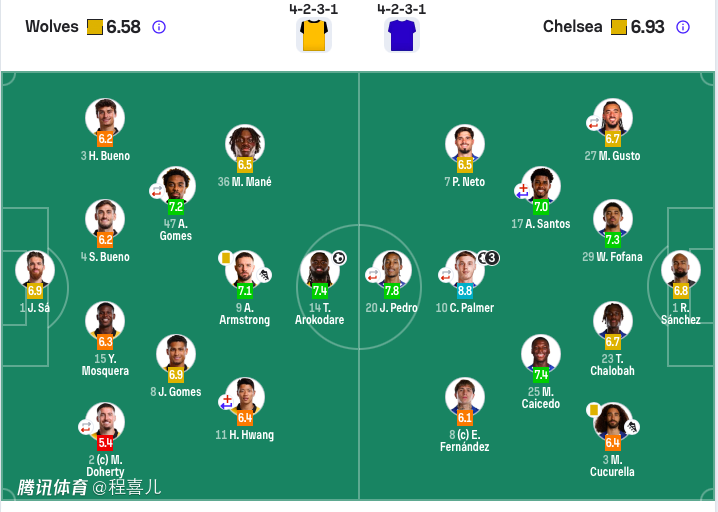 切尔西首发:1-桑切斯、27-古斯托(75’34-乔什·阿昌庞)、29-福法纳、23-查洛巴、3-库库雷利亚、17-桑托斯(84’21-哈托)、25-凯塞多、8-恩佐、10-帕尔默(61’49-加纳乔)、7-内托、20-佩德罗(75’9-德拉普)。