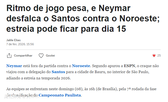 根据ESPN巴西的报道,圣保罗州锦标赛第7轮,桑托斯做客面对诺罗斯特的比赛,内马尔并未跟随球队出征客场,下周末的巴甲联赛,内马尔才有可能迎来本赛季的首秀。