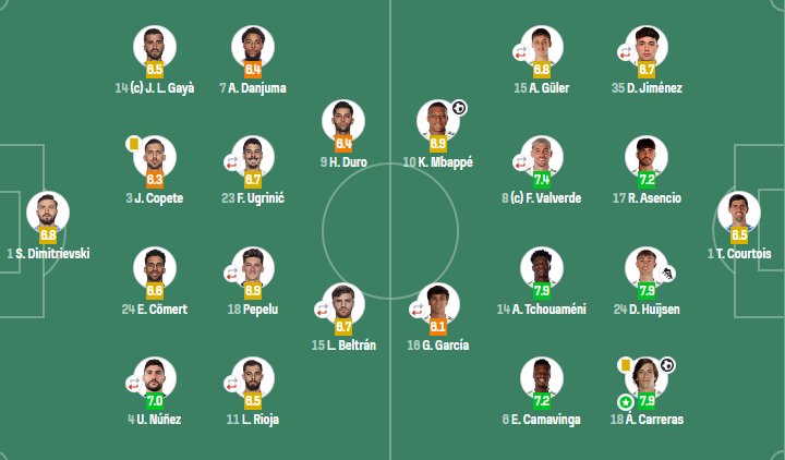皇家马德里(4-4-2):库尔图瓦;戴维-希门尼斯(76'亚历山大-阿诺德),劳尔-阿森西奥,赫伊森,卡雷拉斯;居莱尔(82'马斯坦托诺),巴尔韦德(90'豪尔赫-塞斯特罗),琼阿梅尼,卡马文加;姆巴佩,冈萨洛-加西亚(76'布拉欣-迪亚斯)