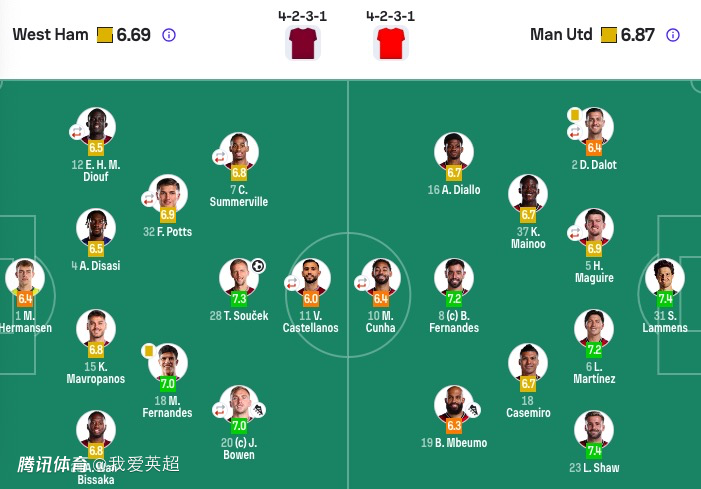 西汉姆联首发:1-赫尔曼森、15-马夫罗帕诺斯、29-万-比萨卡、4-迪萨西、12-迪乌夫