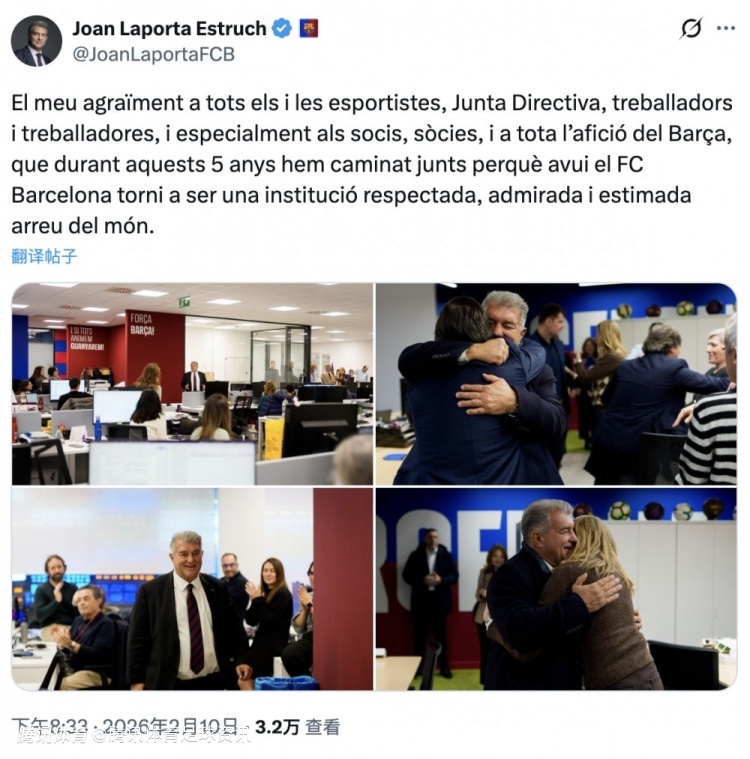 北京时间2月11日,拉波尔塔本周一正式辞去巴萨主席一职。周二,他在个人社交媒体发布图文,向俱乐部员工及球迷告别。