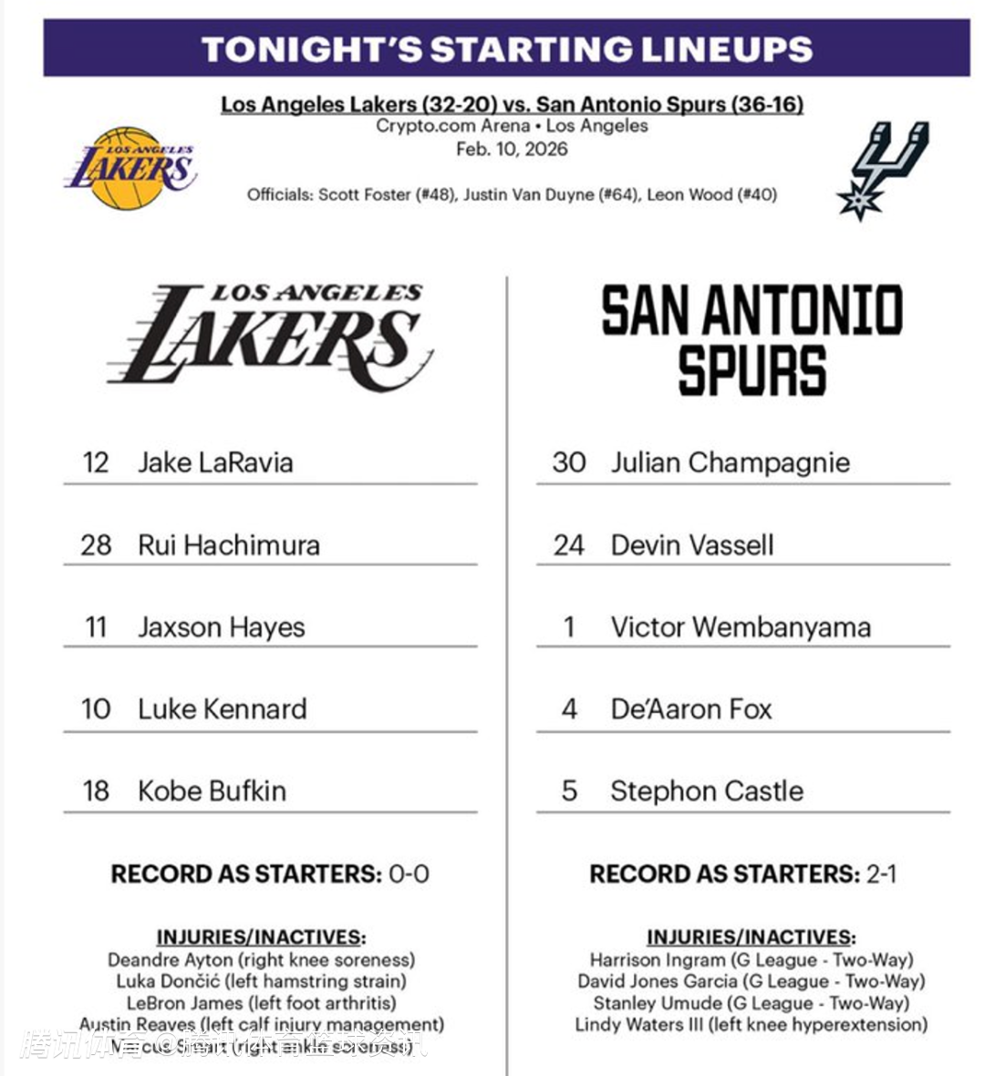 北京时间2月11日,今天上午11点30分,湖人主场对阵马刺,赛前双方的首发阵容出炉,湖人这边詹姆斯、东契奇、里夫斯三名进攻核心全部缺席,拉拉维亚、八村垒领衔首发阵容。
