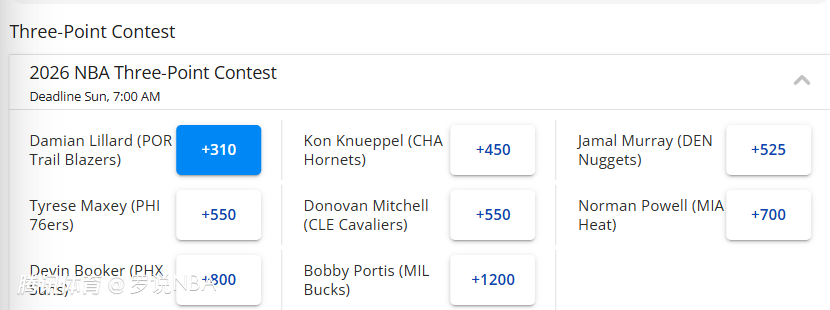 1.利拉德(+310)、2.克努佩尔(+450)、3.穆雷(+525)、4.马克西和米切尔(+550)、6.鲍威尔(+700)、7.布克(+800)、8.波蒂斯(+1200)