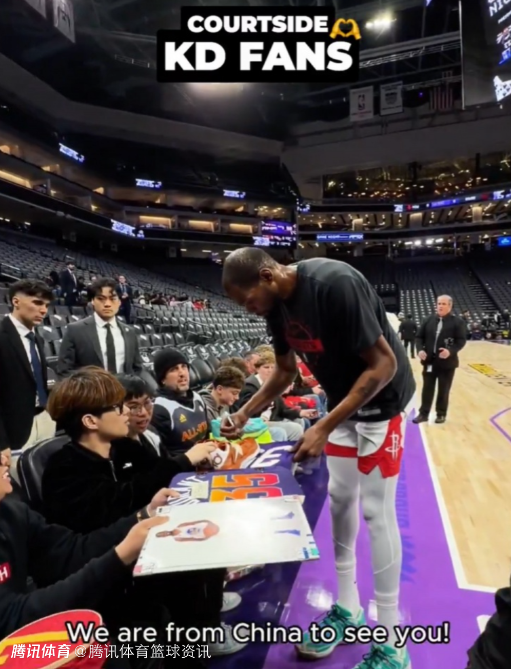 北京时间12月22日,NBA常规赛,火箭对阵国王的赛前,杜兰特来到场边,给中国球迷签名。