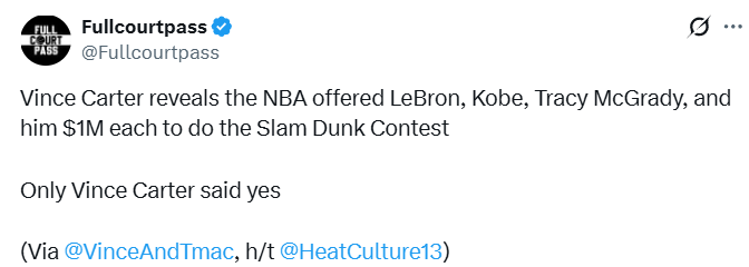 北京时间2月12日,NBA名宿文斯-卡特在播客节目中透露,NBA曾向詹姆斯、科比、麦迪以及他本人各开出100万美元,邀请他们参加扣篮大赛。结果只有卡特答应了。