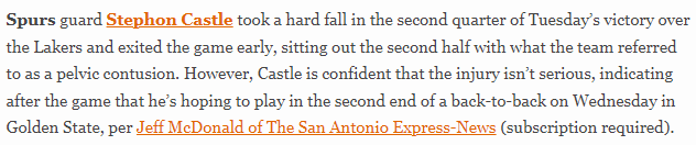 不过据《圣安东尼奥快报》记者杰夫-麦克唐纳报道,卡斯尔相信伤势并不严重,赛后表示希望能出战周四对阵勇士的背靠背第二场比赛。
