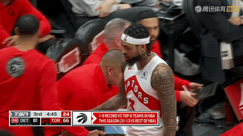 第四节刚开始至还剩9分28秒时,猛龙掀起反扑,在5次连续进攻中由巴雷特罚球、英格拉姆跳投、奎克利抛投以及巴恩斯反手上篮加罚全部得分,把比分从75:94追到83:99,在大比分落后的情况下打出一波缩分攻势。