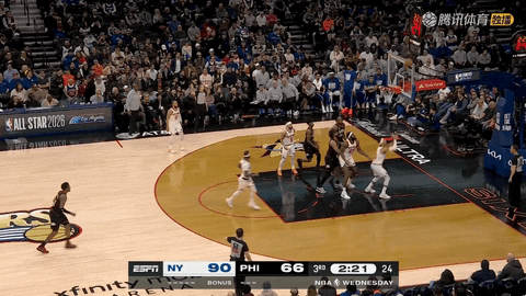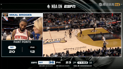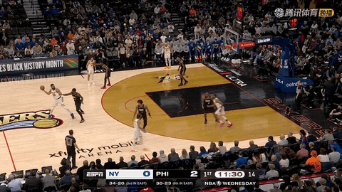 比赛开始还剩11分54秒时,博纳和唐斯完成跳球,随后还剩11分38秒时,博纳转身勾手为76人先拿2分。第一节还剩11分19秒时,布里奇斯接哈特助攻急停跳投命中,帮助尼克斯追成2:2,并拉开了客队的进攻序幕。