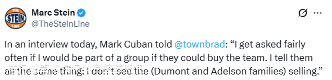 消息源同时补充,杜蒙特与阿德尔森家族仍全力支持达拉斯独行侠以及达拉斯当地社区,并将继续专注于长期打造一支具备总冠军竞争力的球队。