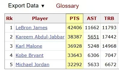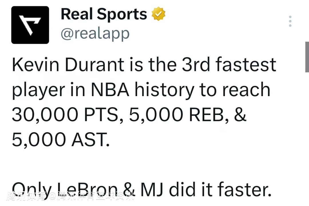 杜兰特也是NBA历史上达成30000分+5000篮板+5000助攻第三快的球员,仅詹姆斯、乔丹比他更快。