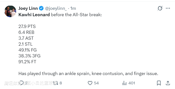 快船官方晒出了决胜一投的海报,末节伦纳德10中6狂砍19分5篮板2助攻2抢断,全场比赛33分钟,20中9,三分5中1,罚球8中8,拿到27分12篮板4助攻4抢断4失误, 命中率45%,三分命中率20%。