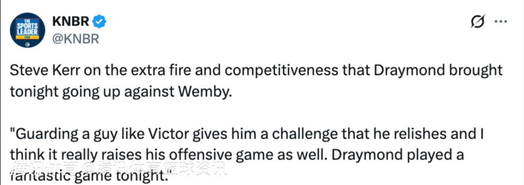 随后他也谈到了追梦今晚对阵文班亚马时,所展现出的额外斗志和竞争力:“防守像文班这样的球员,对他来说是一种乐在其中的挑战,我认为这也确实提升了他的进攻表现。追梦今晚打出了一场非常出色的比赛。”此役追梦拿到17分12篮板8助攻。