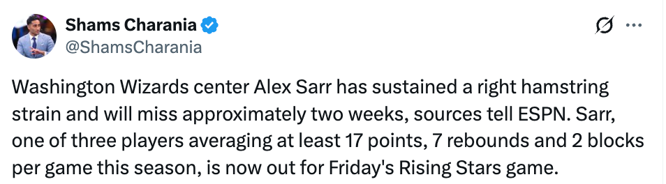北京时间2月12日,据名记Shams报道,华盛顿奇才队中锋萨尔遭遇右腿筋拉伤,将缺席约两周时间。