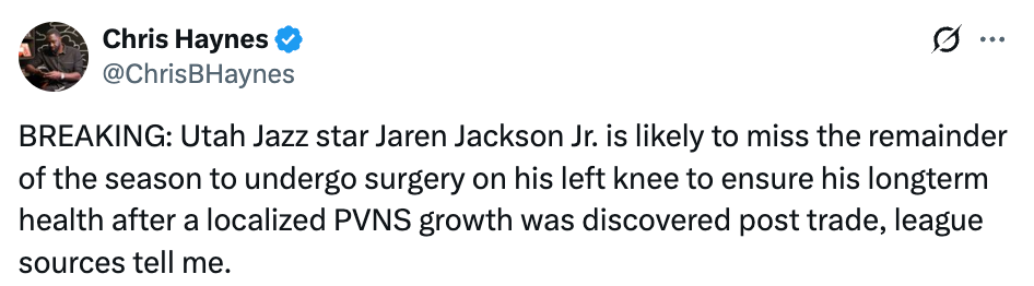 北京时间2月13日,据名记Haynes报道,爵士球星小贾伦-杰克逊很可能因接受左膝手术而缺席本赛季剩余比赛。在交易完成后的检查中,他被发现左膝存在局部PVNS(色素沉着绒毛结节性滑膜炎)增生,手术是为了确保其长期健康。
