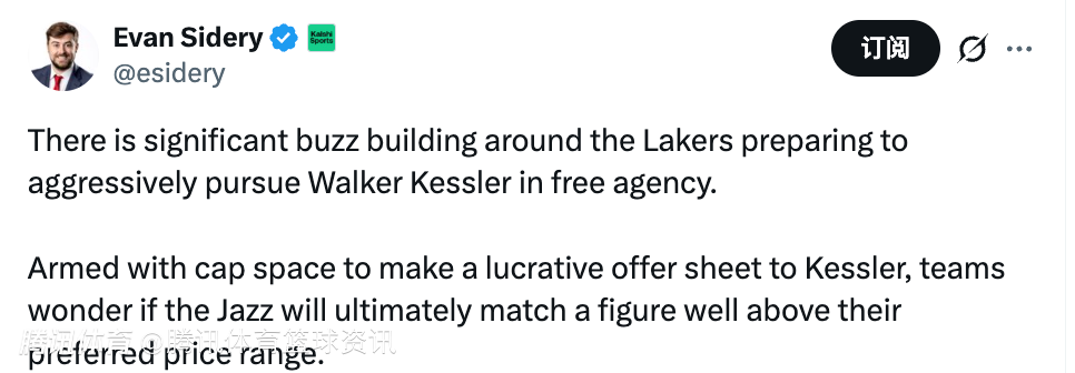 北京时间2月13日,据美记Evan Sidery报道,湖人正准备在自由球员市场上积极追求凯斯勒,相关传闻愈演愈烈。