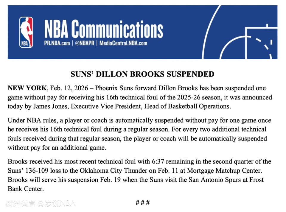 北京时间2月13日,据联盟官方消息,太阳前锋狄龙-布鲁克斯因领到个人本赛季第16次技术犯规,被处以禁赛一场、无薪处罚。狄龙将损失121,403美元的薪水。这笔钱是他21,124,110美元年薪的1/174。太阳队将获得50%的薪资税差额抵免。
