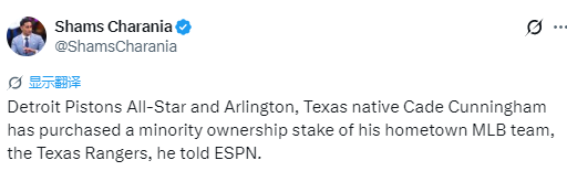 北京时间2月13日,活塞球星坎宁安的职业生涯再添新身份。据名记Shams报道,坎宁安已购入美国职业棒球大联盟(MLB)德州游骑兵队的少数股权,具体持股比例暂未披露。