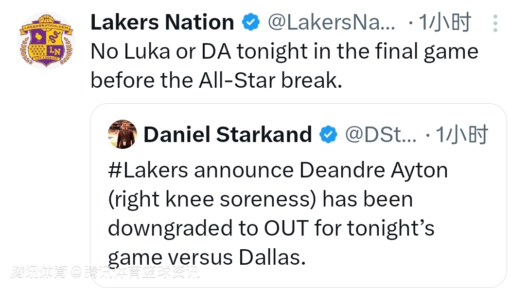 北京时间2月13日,NBA常规赛继续进行,湖人对阵独行侠。赛前,湖人方面公布球队本场比赛伤情报告。艾顿(右膝酸痛)状态调整为缺阵,无缘对阵独行侠的比赛。此前,湖人官方已宣布东契奇同样将缺席全明星赛前最后一战。