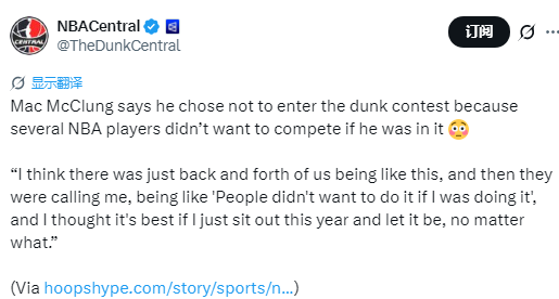 麦克朗还表示,如今扣篮大赛里,能做的动作基本都被尝试过了,想要做出让人眼前一亮的创意难度极大。再加上参赛对身体消耗巨大,心理压力也很重,全场目光聚焦,各种评判和挑剔接踵而至。所以他认为,全明星周末本来就是难得的休息时间,很多球员都不想再为此消耗自己。