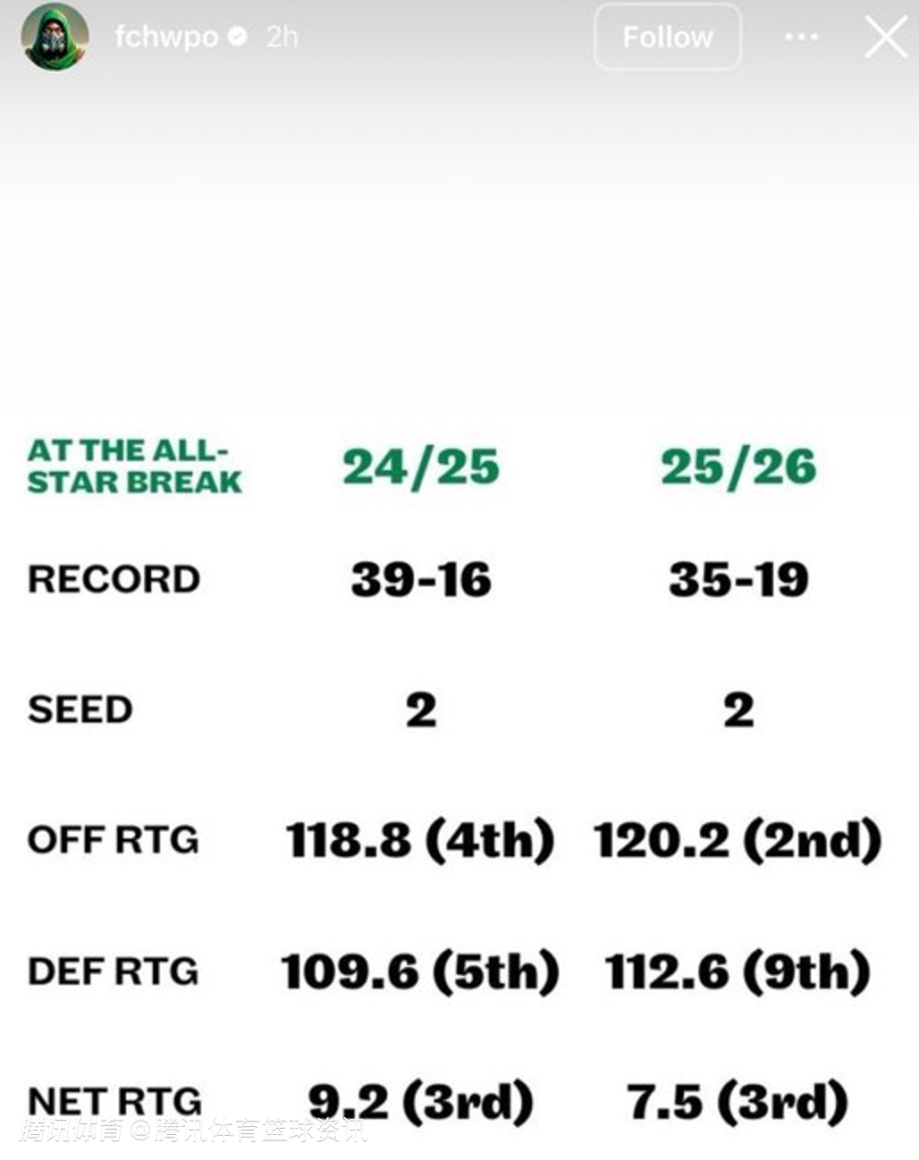 24-25赛季全明星赛前,凯尔特人取得了39胜16负的战绩,位列分区第2,进攻效率118.8(联盟第4),防守效率109.6(联盟第5),净效率9.2(联盟第3);而在本赛季,球队战绩为35胜19负,分区排名仍为第2,进攻效率为120.2(联盟第2),防守效率为112.6(联盟第9),净效率为7.5(联盟第3)。