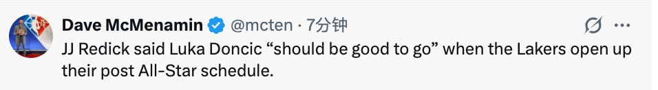 雷迪克透露,艾顿将缺席今天和独行侠的比赛,东契奇也将作壁上观:“艾顿对膝盖进行了MRI检查,结果一切正常。和东契奇情况类似,他应该能在全明星赛后复出,东契奇可能会在下周六对阵快船的比赛中复出。这场和独行侠的比赛,里夫斯的出场时间仍将限制在25-30分钟。”