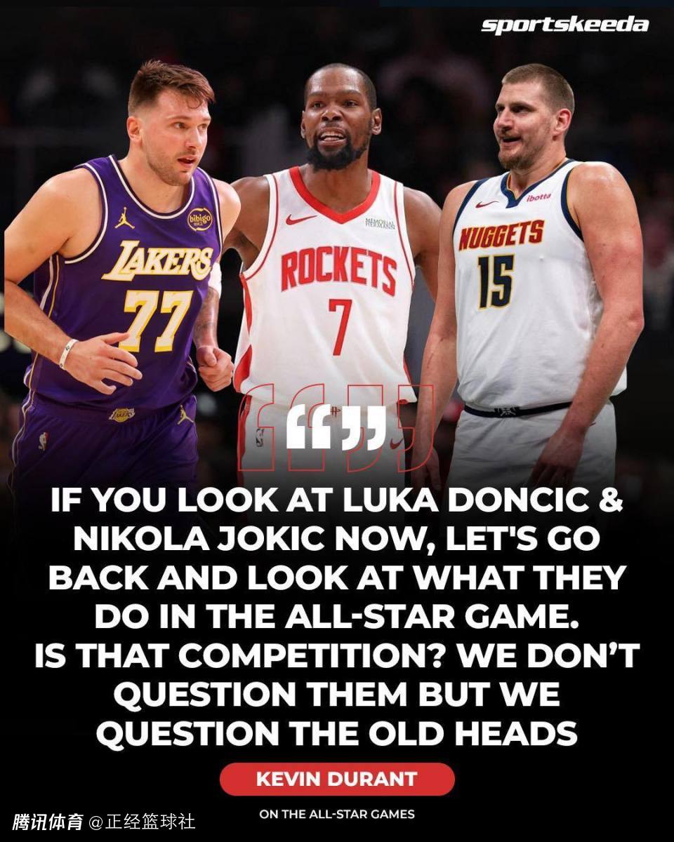 当被问到他自称的“老家伙队”(美国队)在正赛里会不会认真打,杜兰特表示:“你们应该去问问欧洲球员、世界队的人想不想真打。看看东契奇、约基奇,回头看看他们在全明星赛上都做了什么。那叫竞争吗?我们从来没质疑过他们的打法,反倒来质疑我们这些老家伙、美国队。但那两位东契奇和约基奇,他们根本不在乎这场比赛。他们往地上一躺,半场就扔,结果你们反倒担心我们老家伙不认真打。”