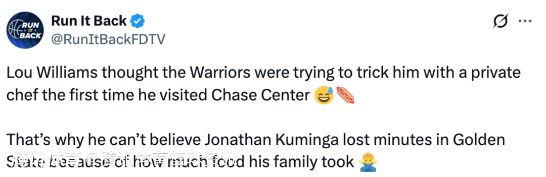 今天稍早前,前NBA球星路威也在节目中谈及此事:“我才不信这是真的,也太离谱了。我后来才确定,一开始有人说那是巴特勒,他还发了一堆笑哭表情。意思就是,你把食物摆出来,家人可以随便拿,尤其是在勇士那边。你去他们新球馆就知道,设施超一流,甚至还给客队配备了现场厨师,真的,他们给客队配现做的厨师。”
