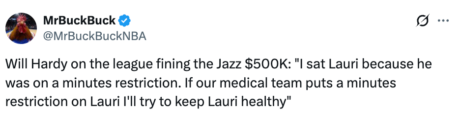 今天爵士和开拓者赛后,爵士主帅哈迪接受采访时,谈到了爵士被罚款一事,他表示:“我让马尔卡宁休战,是因为他有出场时间限制。如果我们的医疗团队对他设置了出场时间限制,我会尽力保障他的健康。”