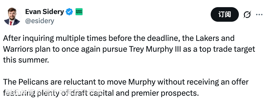 北京时间2月14日,据美记Evan Sidery报道,在交易截止日前多次询价后,湖人与勇士计划在今年夏天再次将特雷-墨菲三世列为首要交易目标。鹈鹕方面则不愿轻易送走墨菲,除非收到包含大量选秀权和顶级新秀的报价。